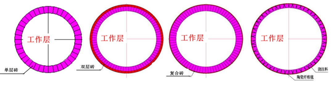 耐火磚掉磚、抽簽等問題。對于危廢回轉窯系統(tǒng)而言,由于轉速比較慢,一般在1轉/分以下,可以根據(jù)廠房設計和節(jié)能要求選擇單層磚、雙層磚、復合磚和整體澆注等不同結構,如圖3所示。回轉窯耐火材料總厚度一般是250-300mm不等,其中工作層